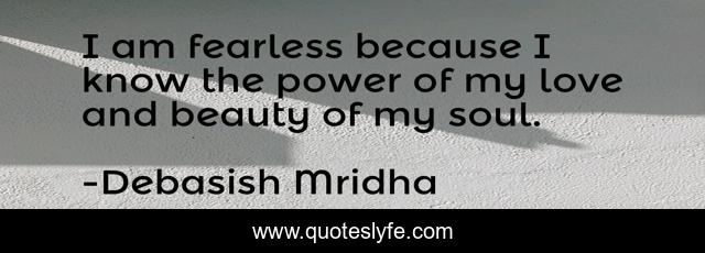 This page presents the quote "I am fearless because I know the power of my love and beauty of my soul.". Author of this quote is Debasish Mridha. This quote is about inspirational, philosophy, debasish-mridha, power-of-love, quotes, beauty-of-my-soul, enthusiasm, debasish-mridha-m-d, be-fearless,.