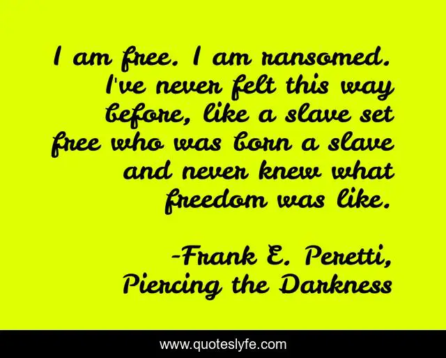 This page presents the quote "I am free. I am ransomed. I've never felt this way before, like a slave set free who was born a slave and never knew what freedom was like.". Author of this quote is Frank E. Peretti, Piercing the Darkness. This quote is about jesus-christ, freedom, piercing-the-darkness, salvation, frank-e-peretti,.