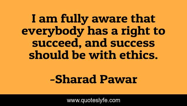 This page presents the quote "I am fully aware that everybody has a right to succeed, and success should be with ethics.". Author of this quote is Sharad Pawar. This quote is about ethics, succeed,.