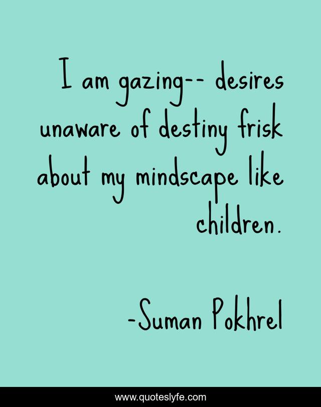 This page presents the quote "I am gazing-- desires unaware of destiny frisk about my mindscape like children.". Author of this quote is Suman Pokhrel. This quote is about desire, life,.