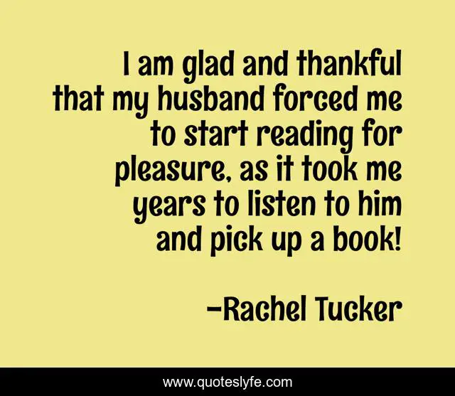This page presents the quote "I am glad and thankful that my husband forced me to start reading for pleasure, as it took me years to listen to him and pick up a book!". Author of this quote is Rachel Tucker. This quote is about reading, book,.