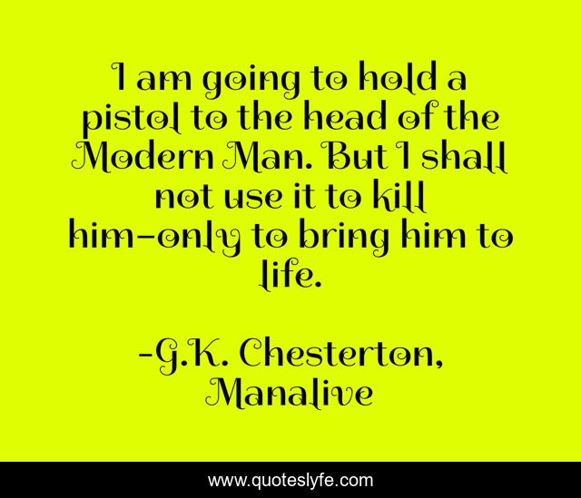 This page presents the quote "I am going to hold a pistol to the head of the Modern Man. But I shall not use it to kill him–only to bring him to life.". Author of this quote is G.K. Chesterton, Manalive. This quote is about joy, life, pessimism,.