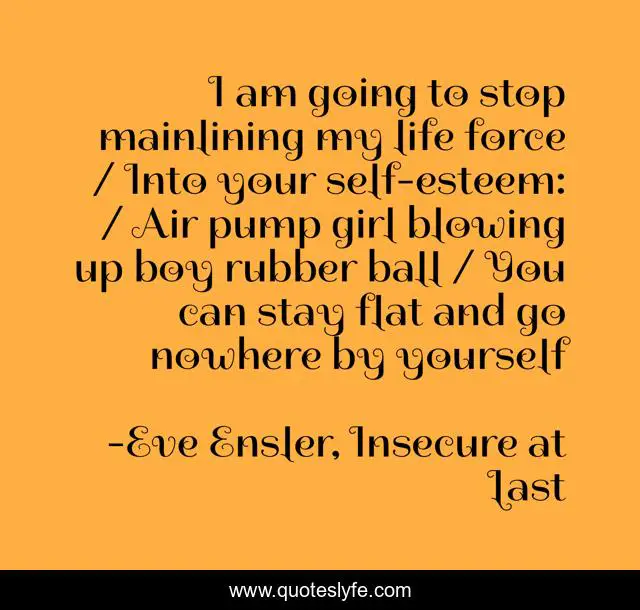 This page presents the quote "I am going to stop mainlining my life force / Into your self-esteem: / Air pump girl blowing up boy rubber ball / You can stay flat and go nowhere by yourself". Author of this quote is Eve Ensler, Insecure at Last. This quote is about women-empowerment, women-and-men, women,.