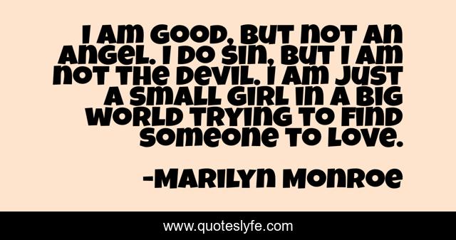 This page presents the quote "I am good, but not an angel. I do sin, but I am not the devil. I am just a small girl in a big world trying to find someone to love.". Author of this quote is Marilyn Monroe. This quote is about world, good,.