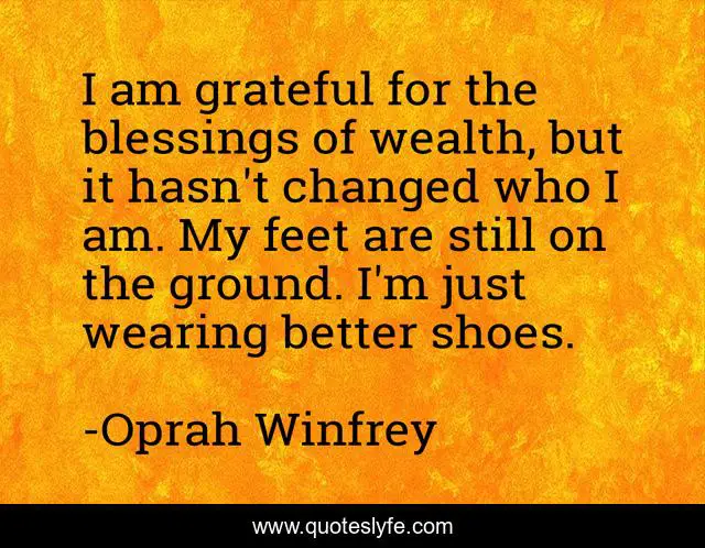This page presents the quote "I am grateful for the blessings of wealth, but it hasn't changed who I am. My feet are still on the ground. I'm just wearing better shoes.". Author of this quote is Oprah Winfrey. .