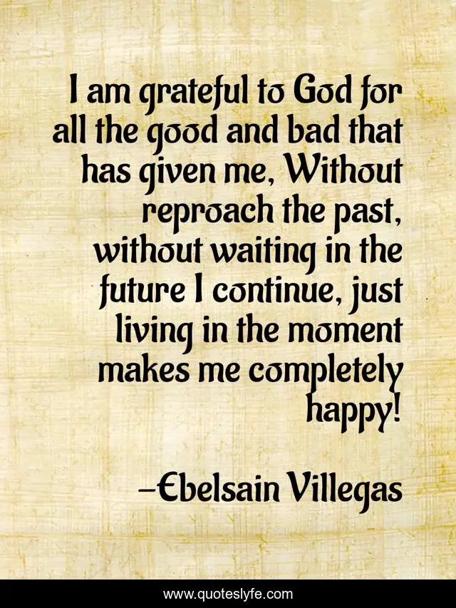 This page presents the quote "I am grateful to God for all the good and bad that has given me, Without reproach the past, without waiting in the future I continue, just living in the moment makes me completely happy!". Author of this quote is Ebelsain Villegas. This quote is about living, god, past, moment, future, grateful, gratefulness, reproach, happy,.
