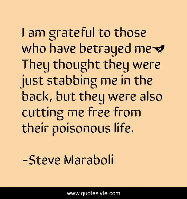 This page presents the quote "I am grateful to those who have betrayed me… They thought they were just stabbing me in the back, but they were also cutting me free from their poisonous life.". Author of this quote is Steve Maraboli. This quote is about gratitude, betrayal, back-stabbing,.
