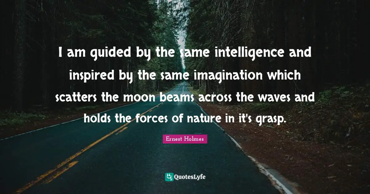 This page presents the quote "I am guided by the same intelligence and inspired by the same imagination which scatters the moon beams across the waves and holds the forces of nature in it's grasp.". Author of this quote is Ernest Holmes. This quote is about forces of nature, imagination, moon, intelligence, inspired,.
