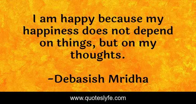 This page presents the quote "I am happy because my happiness does not depend on things, but on my thoughts.". Author of this quote is Debasish Mridha. This quote is about happy, life, love, knowledge, inspirational, intelligence, philosophy, affection, wisdom,.