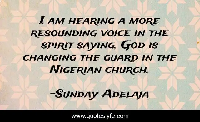 This page presents the quote "I am hearing a more resounding voice in the spirit saying, God is changing the guard in the Nigerian church.". Author of this quote is Sunday Adelaja. This quote is about saying, resounding, i, god, hearing, nigerian, guard, changing, voice,.