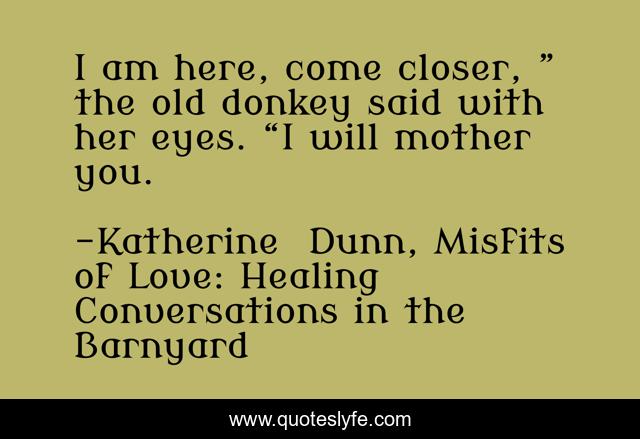 This page presents the quote "I am here, come closer, ” the old donkey said with her eyes. “I will mother you.". Author of this quote is Katherine Dunn, Misfits of Love: Healing Conversations in the Barnyard. This quote is about donkey, misfits-of-love, katherine-dunn, healing, animal, apifera-farm,.