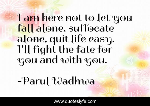 This page presents the quote "I am here not to let you fall alone, suffocate alone, quit life easy. I'll fight the fate for you and with you.". Author of this quote is Parul Wadhwa. This quote is about love-is-insanity, promises, love, the-masquerade, quote-of-the-day, love-story, quotes-about-life, delhite, quotes-to-live-by,.