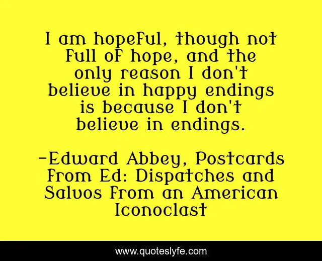 This page presents the quote "I am hopeful, though not full of hope, and the only reason I don't believe in happy endings is because I don't believe in endings.". Author of this quote is Edward Abbey, Postcards from Ed: Dispatches and Salvos from an American Iconoclast. This quote is about happy-endings, hope,.