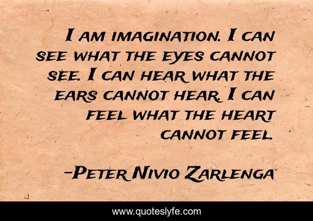 This page presents the quote "I am imagination. I can see what the eyes cannot see. I can hear what the ears cannot hear. I can feel what the heart cannot feel.". Author of this quote is Peter Nivio Zarlenga. This quote is about heart, eyes,.