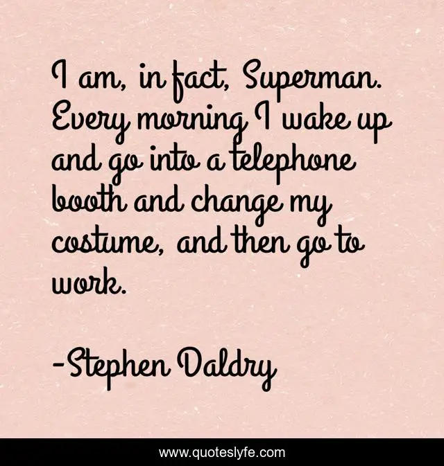 This page presents the quote "I am, in fact, Superman. Every morning I wake up and go into a telephone booth and change my costume, and then go to work.". Author of this quote is Stephen Daldry. This quote is about work, change,.