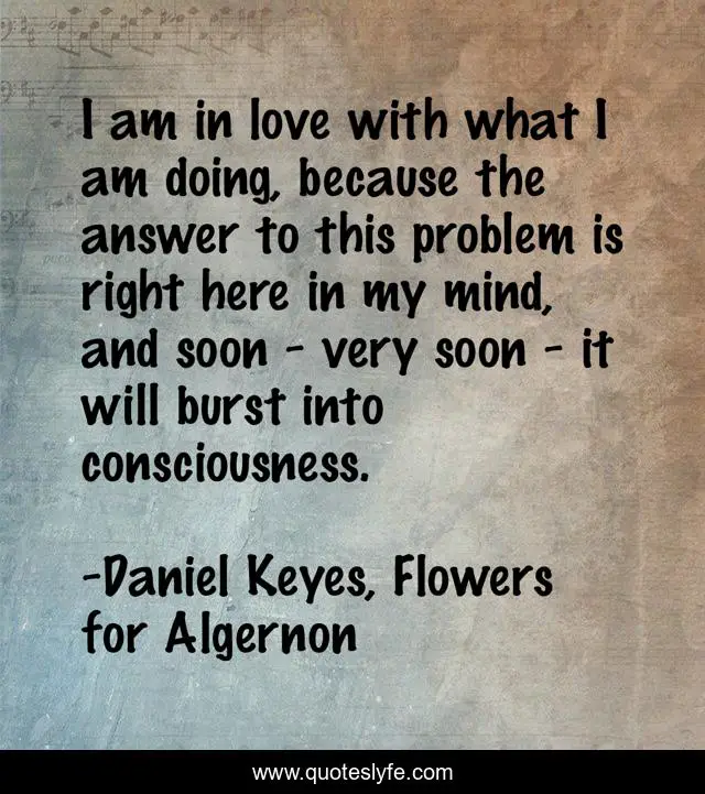 This page presents the quote "I am in love with what I am doing, because the answer to this problem is right here in my mind, and soon - very soon - it will burst into consciousness.". Author of this quote is Daniel Keyes, Flowers for Algernon. This quote is about answer, problem, mind, in-love,.