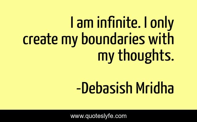 This page presents the quote "I am infinite. I only create my boundaries with my thoughts.". Author of this quote is Debasish Mridha. This quote is about i-am-infinite, i-create-my-boundaries, philosophy, debasish-mridha, boundaries, quotes, debasish-mridha-md, inspirational, infinite,.