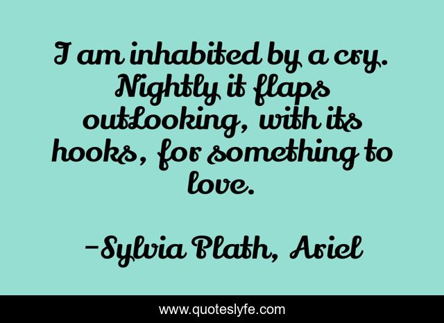 This page presents the quote "I am inhabited by a cry. Nightly it flaps outLooking, with its hooks, for something to love.". Author of this quote is Sylvia Plath, Ariel. This quote is about longing, love, poetry, affection, yearning,.