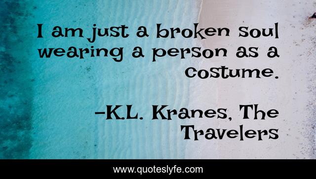 This page presents the quote "I am just a broken soul wearing a person as a costume.". Author of this quote is K.L. Kranes, The Travelers. This quote is about fantasy, thetravelers, inspirational, enthusiasm,.