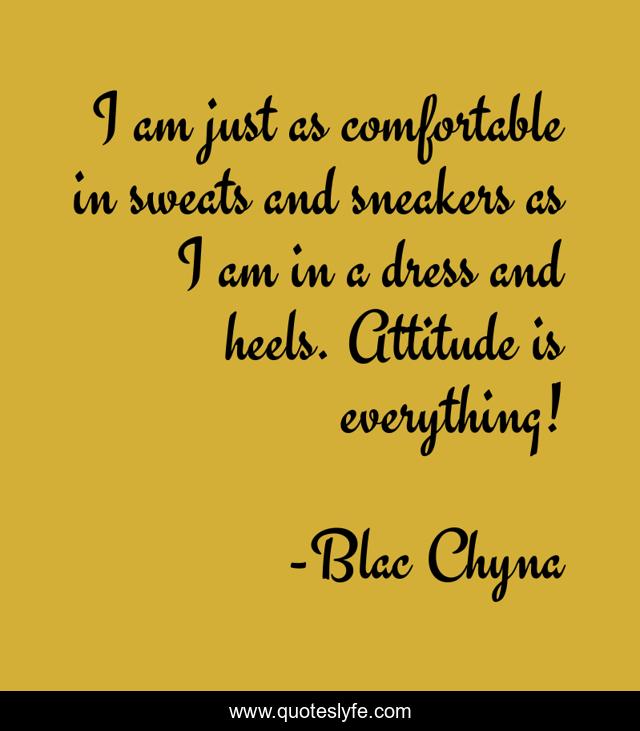 This page presents the quote "I am just as comfortable in sweats and sneakers as I am in a dress and heels. Attitude is everything!". Author of this quote is Blac Chyna. This quote is about dress, sneakers,.
