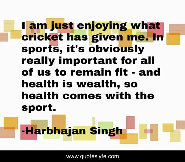 This page presents the quote "I am just enjoying what cricket has given me. In sports, it's obviously really important for all of us to remain fit - and health is wealth, so health comes with the sport.". Author of this quote is Harbhajan Singh. This quote is about me, health,.