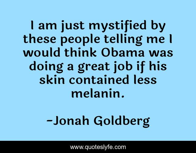 This page presents the quote "I am just mystified by these people telling me I would think Obama was doing a great job if his skin contained less melanin.". Author of this quote is Jonah Goldberg. This quote is about race, twitter, race-card, racism, barack-obama, presidency-of-barack-obama, bigotry, politics, 2011,.