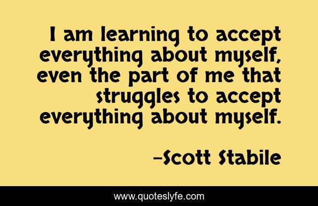 This page presents the quote "I am learning to accept everything about myself, even the part of me that struggles to accept everything about myself.". Author of this quote is Scott Stabile. This quote is about life, acceptance, love, affection, inspiration,.