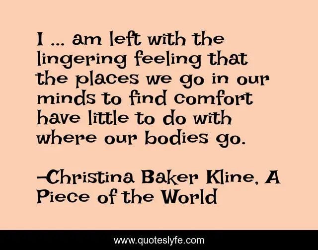 This page presents the quote "I ... am left with the lingering feeling that the places we go in our minds to find comfort have little to do with where our bodies go.". Author of this quote is Christina Baker Kline, A Piece of the World. This quote is about grief, death, comfort, bodies, solace,.