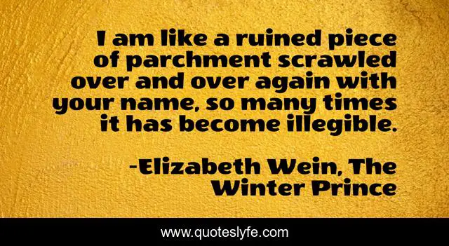 This page presents the quote "I am like a ruined piece of parchment scrawled over and over again with your name, so many times it has become illegible.". Author of this quote is Elizabeth Wein, The Winter Prince. This quote is about despair, young-adult, arthurian-legend,.