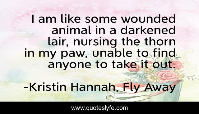 This page presents the quote "I am like some wounded animal in a darkened lair, nursing the thorn in my paw, unable to find anyone to take it out.". Author of this quote is Kristin Hannah, Fly Away. This quote is about loss, pain,.
