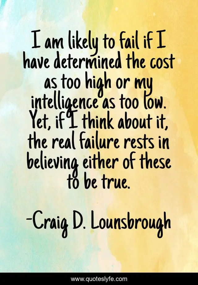 This page presents the quote "I am likely to fail if I have determined the cost as too high or my intelligence as too low. Yet, if I think about it, the real failure rests in believing either of these to be true.". Author of this quote is Craig D. Lounsbrough. This quote is about denial, deception, failed, intelligence, distortion, failure, cost, truth, fail,.