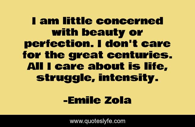 This page presents the quote "I am little concerned with beauty or perfection. I don't care for the great centuries. All I care about is life, struggle, intensity.". Author of this quote is Emile Zola. This quote is about life, great, struggle,.