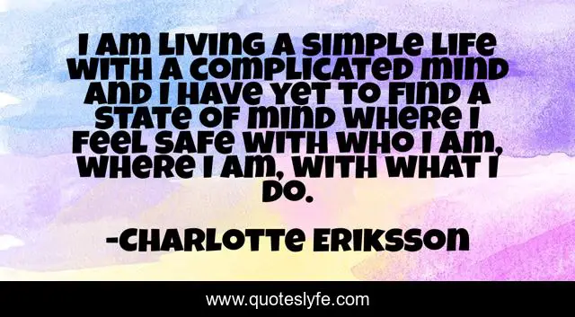 This page presents the quote "I am living a simple life with a complicated mind and I have yet to find a state of mind where I feel safe with who I am, where I am, with what I do.". Author of this quote is Charlotte Eriksson. This quote is about living, life, what-i-do, who-i-am, artist, feel, self-discovery, self, safe,.