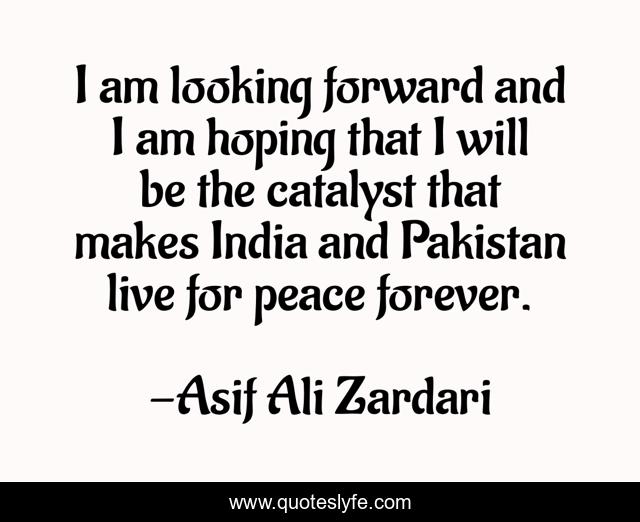 This page presents the quote "I am looking forward and I am hoping that I will be the catalyst that makes India and Pakistan live for peace forever.". Author of this quote is Asif Ali Zardari. .