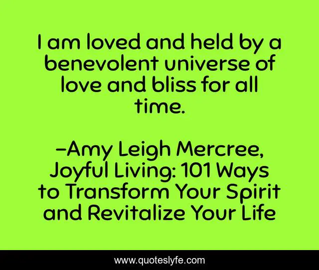 This page presents the quote "I am loved and held by a benevolent universe of love and bliss for all time.". Author of this quote is Amy Leigh Mercree, Joyful Living: 101 Ways to Transform Your Spirit and Revitalize Your Life. This quote is about life, quotes-de-la-vida, amy-leigh-mercree, quote-of-the-day, quotes-for-instagram, quote-about-life, joyful-living, quotes-tumblr, bliss,.