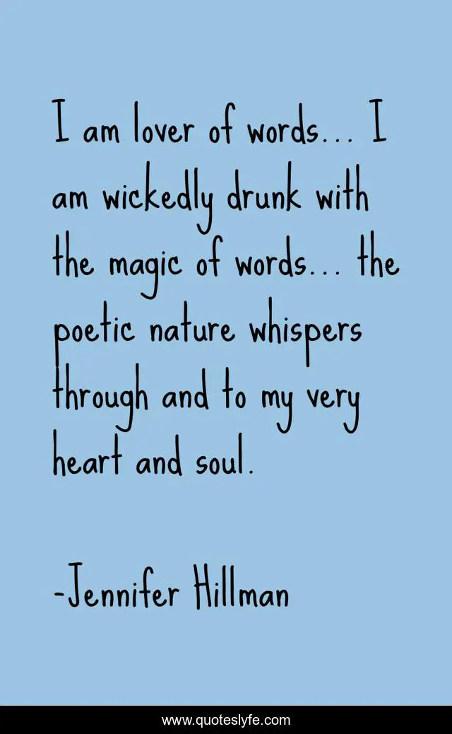 This page presents the quote "I am lover of words... I am wickedly drunk with the magic of words... the poetic nature whispers through and to my very heart and soul.". Author of this quote is Jennifer Hillman. This quote is about wordsmith, passion, poetry, nature,.