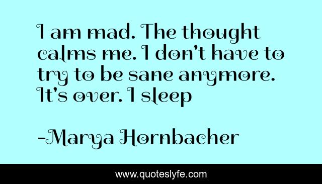 This page presents the quote "I am mad. The thought calms me. I don't have to try to be sane anymore. It's over. I sleep". Author of this quote is Marya Hornbacher. This quote is about mental-health, bipolar-disorder,.
