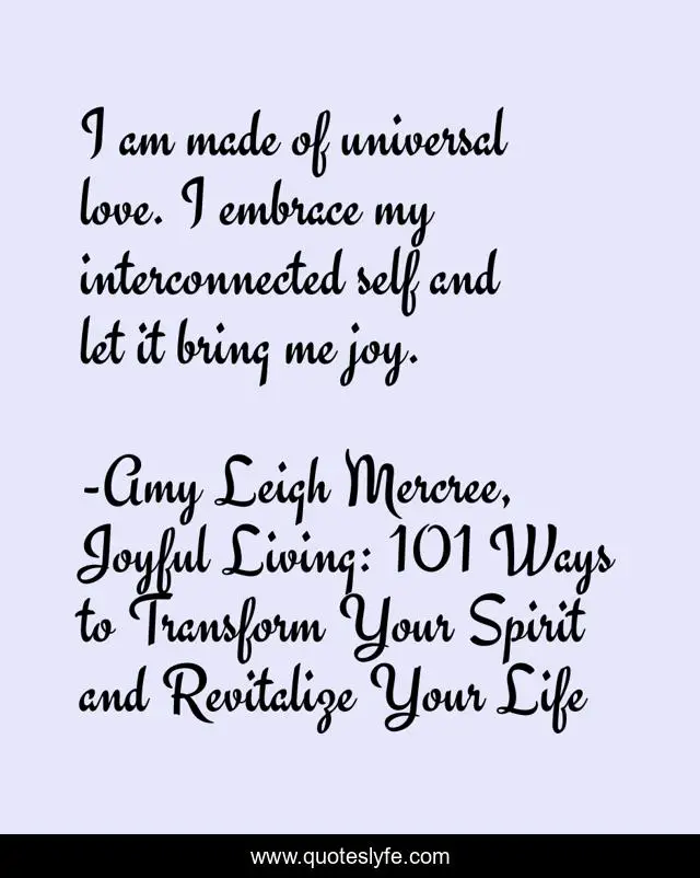 This page presents the quote "I am made of universal love. I embrace my interconnected self and let it bring me joy.". Author of this quote is Amy Leigh Mercree, Joyful Living: 101 Ways to Transform Your Spirit and Revitalize Your Life. This quote is about quotes-de-la-vida, amy-leigh-mercree, quote-of-the-day, quotes-tumblr, inspirational, quote-about-life, enthusiasm, quotes-twitter, quote-of-the-week,.