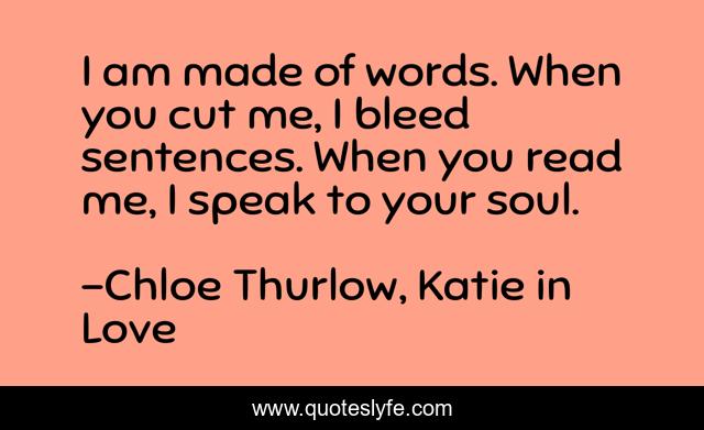 This page presents the quote "I am made of words. When you cut me, I bleed sentences. When you read me, I speak to your soul.". Author of this quote is Chloe Thurlow, Katie in Love. This quote is about writing-life, blood, reading-habits,.