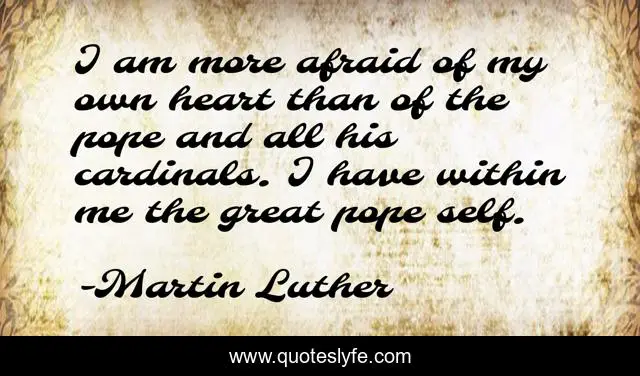 This page presents the quote "I am more afraid of my own heart than of the pope and all his cardinals. I have within me the great pope self.". Author of this quote is Martin Luther. .