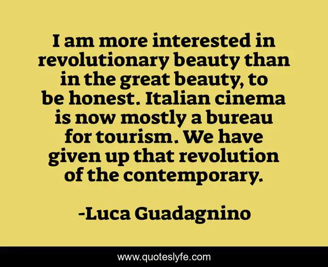 This page presents the quote "I am more interested in revolutionary beauty than in the great beauty, to be honest. Italian cinema is now mostly a bureau for tourism. We have given up that revolution of the contemporary.". Author of this quote is Luca Guadagnino. This quote is about great, revolution,.