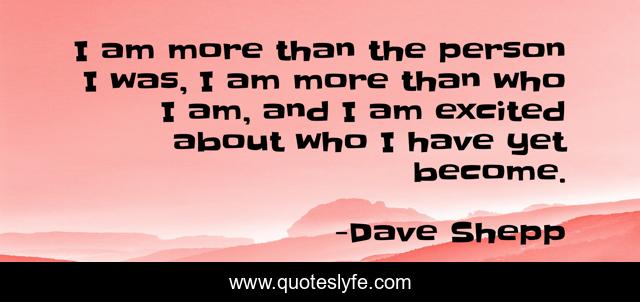 This page presents the quote "I am more than the person I was, I am more than who I am, and I am excited about who I have yet become.". Author of this quote is Dave Shepp. This quote is about lifecoach, learning, improvement,.