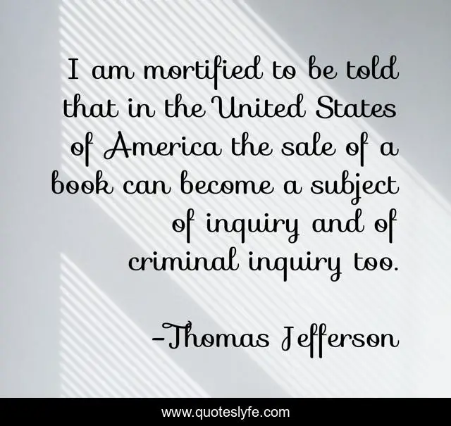 This page presents the quote "I am mortified to be told that in the United States of America the sale of a book can become a subject of inquiry and of criminal inquiry too.". Author of this quote is Thomas Jefferson. .