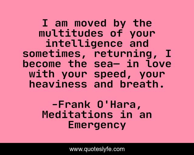 This page presents the quote "I am moved by the multitudes of your intelligence and sometimes, returning, I become the sea— in love with your speed, your heaviness and breath.". Author of this quote is Frank O'Hara, Meditations in an Emergency. This quote is about respect, frank-o-hara, love, ode, affection,.