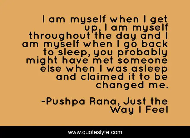 This page presents the quote "I am myself when I get up, I am myself throughout the day and I am myself when I go back to sleep, you probably might have met someone else when I was asleep and claimed it to be changed me.". Author of this quote is Pushpa Rana, Just the Way I Feel. This quote is about me, myself, sleep, change, poor-judgement, identity,.