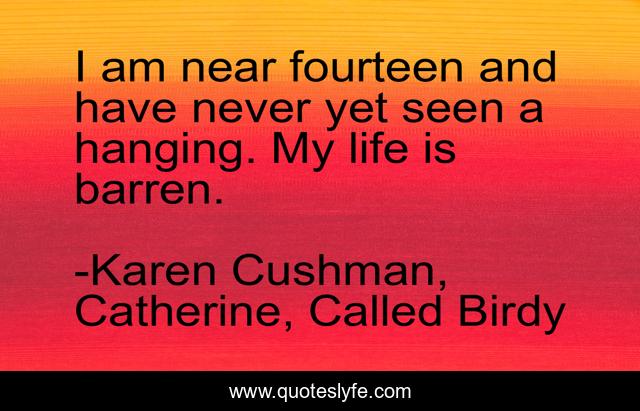 This page presents the quote "I am near fourteen and have never yet seen a hanging. My life is barren.". Author of this quote is Karen Cushman, Catherine, Called Birdy. This quote is about life, death, the-more-things-change, teenagers, lol, boredom, hanging,.
