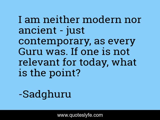 This page presents the quote "I am neither modern nor ancient - just contemporary, as every Guru was. If one is not relevant for today, what is the point?". Author of this quote is Sadghuru. This quote is about ancient, contemporary, guru,.