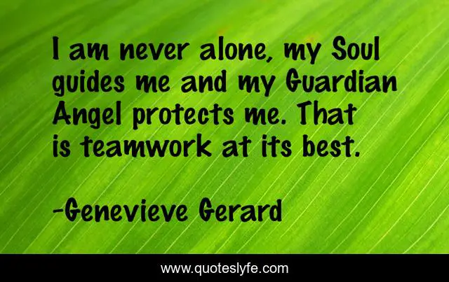 This page presents the quote "I am never alone, my Soul guides me and my Guardian Angel protects me. That is teamwork at its best.". Author of this quote is Genevieve Gerard. This quote is about awake-my-soul, connect-with-your-soul, angels, quotes-about-the-soul, guardian-angels, soul, guardian-angel, quotes-by-genevieve-gerard, connect-to-the-soul,.