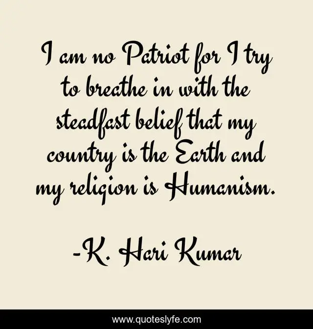 This page presents the quote "I am no Patriot for I try to breathe in with the steadfast belief that my country is the Earth and my religion is Humanism.". Author of this quote is K. Hari Kumar. This quote is about rationalist, humanistic-spirituality, patriotismts, humanism, k-hari-kumar, spirituality, humanistic, harism, inspirational,.