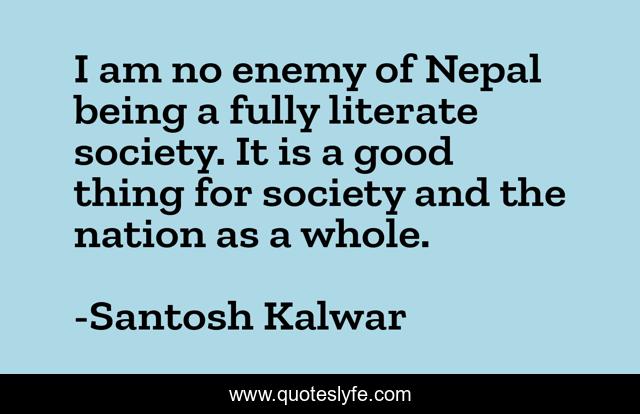 This page presents the quote "I am no enemy of Nepal being a fully literate society. It is a good thing for society and the nation as a whole.". Author of this quote is Santosh Kalwar. This quote is about illiterate, literaturea, literate, nepal, nation, society, education,.